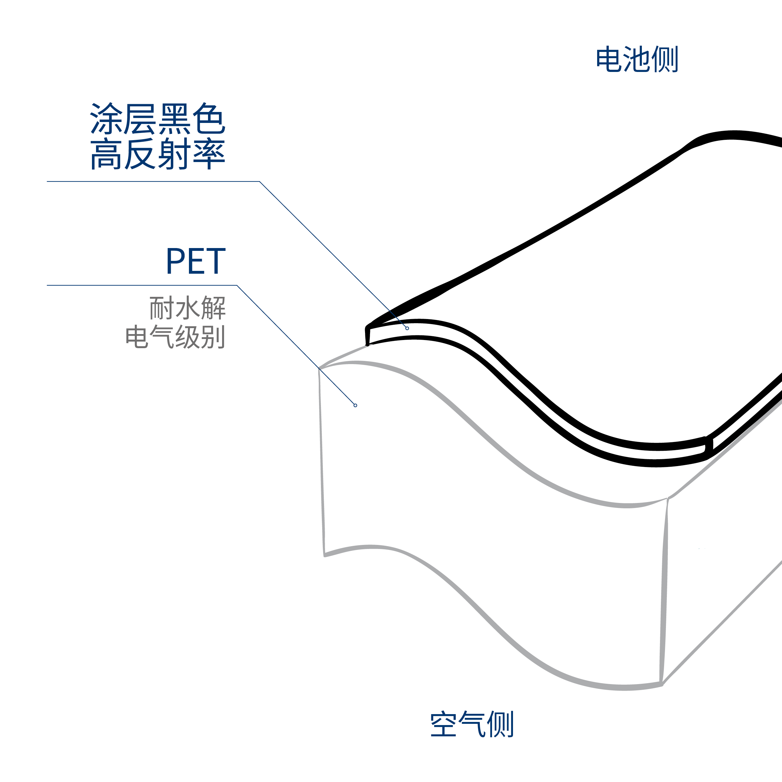 dyMat®黑色高反射率還具有較高的封裝粘合能力、優(yōu)異的大氣保護(hù)性能和長(zhǎng)期抗水解性能,是一款性能卓越、美觀的解決方案,適用于光伏組件生產(chǎn)商和終端客戶。BKHR涂層也可用于其他dyMat®背板組合物。